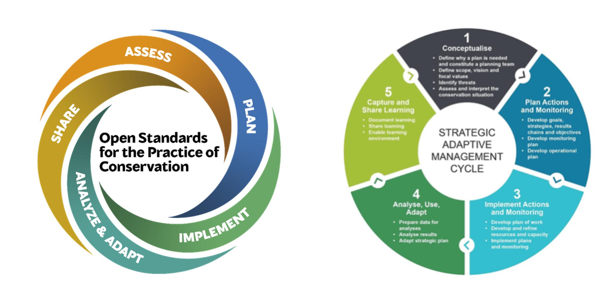 The Conservation Standards (CS) are a widely adopted set of principles and practices drawn from several fields, that bring together common concepts, approaches, and terminology for conservation project design, management, and monitoring. Developed by the Conservation Measures Partnership and regularly updated in collaboration with the broader community, the CS is an open-source, strategic systematic process (source: conservationstandards.org/about/). The CS facilitates planning for, and implementation of, adaptive management through common language, capacity building, stakeholder engagement, the articulation of clear goals and objectives, and developing clear linkages between strategic intent, the conservation situation, strategies, and monitoring and evaluation.